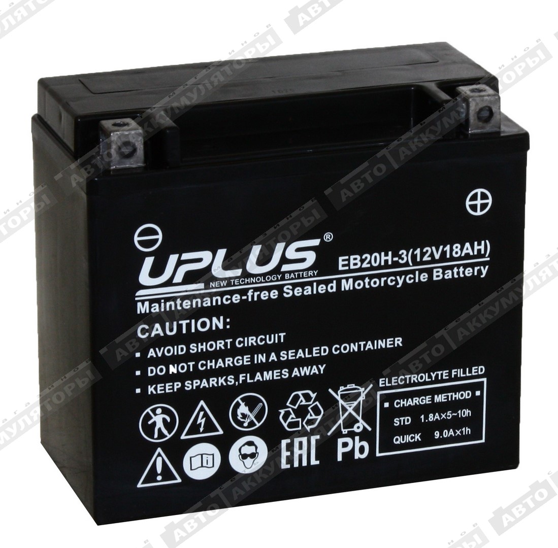 Аккумулятор UPLUS LEOCH EB20H-3 (CT12201 YTX20HL) 12В 18Ач 310CCA 175x87x155 мм Полярность обратная (-+) Стартерный АКБ разработан специально для мототехники. Посадочные размеры соответствуют следующим моделям DELTA и YUASA (CT12201 YTX20HL) Общие характеристики для серии «EB» LEOCH UPLUS: Литая конструкция клеммыи крышки аккумуляторного отсека. Герметичная структура корпуса. Высокая производительность, Долгий срок службы. Высокий CCA и хорошие стартовые характеристики. Хорошо принимают заряди устойчивык вибрации. Применение технологии AGM. Применение технологий COS и TTP. Усовершенствованная сульфатостойкая технология. Усовершенствованная технология кальциево-свинцового сплава, не требующая технического обслуживания. Надежная конструкция герметичного уплотнения с регулируемым клапаном.