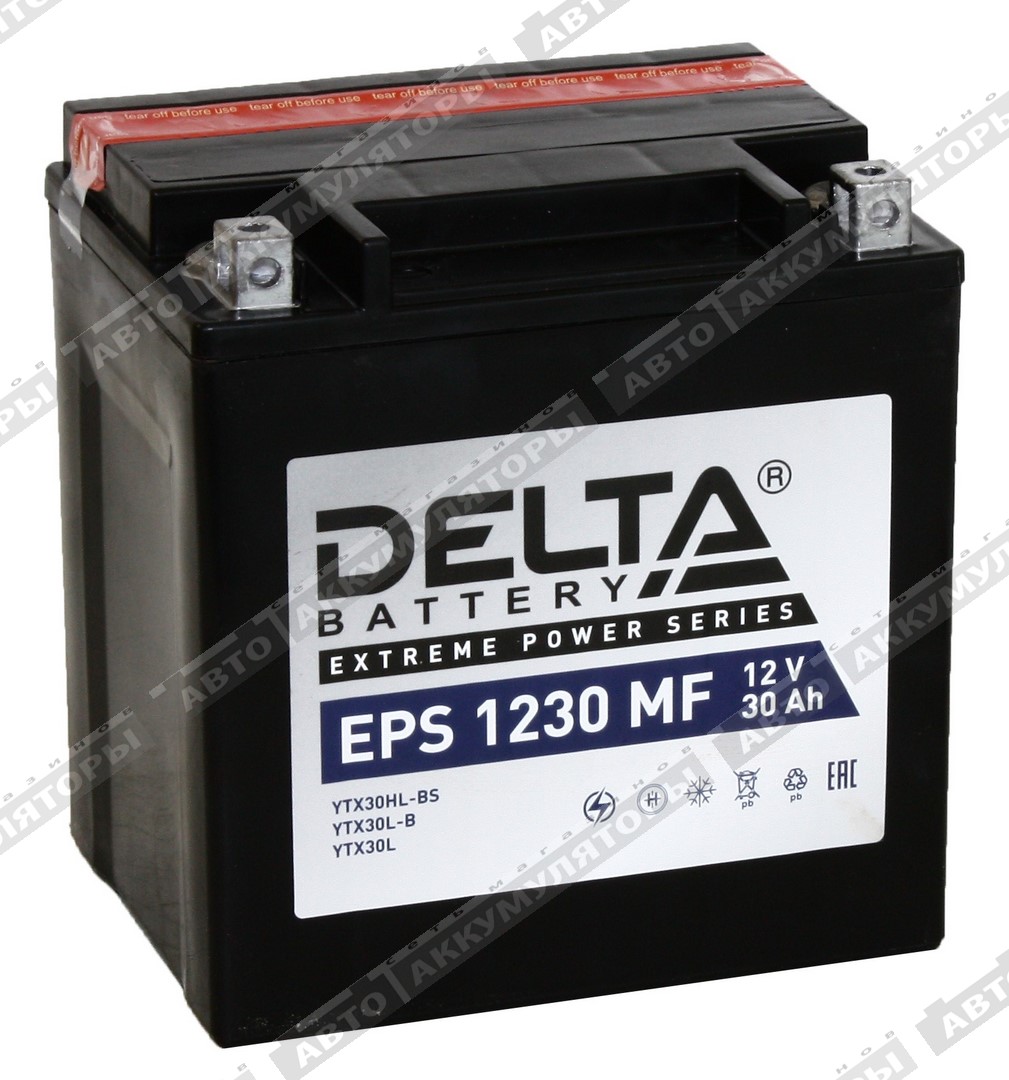 Мощный усиленный AGM мотоаккумулятор DELTA EPS1230 MF, поставляется сухозаряженным с комплектом электролита, который после заливки адсорбируется в стекломаты вокруг пластин, таким образом жидкого электролита внутри нет, аккумулятор герметично закрывается пробками и может эксплуатироваться в любом положении, течь исключена.