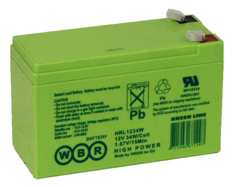 WBR HRL1234W F2 - герметизированные, выполненные по технологии AGM, батареи общего применения с увеличенным до 12 лет сроком службы в буферном режиме или 450 циклов заряда-разряда в циклическом режиме при 50% разряде. Эти высокоэффективные перезаряжаемые батареи не требуют обслуживания в течение всего срока службы.